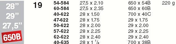 Rozpiska opon na które pasuje odpowiedni numer/typ dętki.