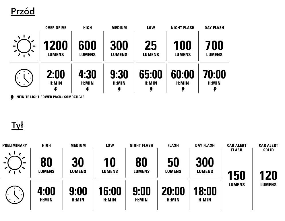 - Przednie: maks. 1200 lumenów / 70 godzin pracy.