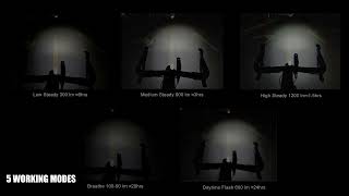 • 5 Trybów świecenia: Stałe 1200 Lum - 1.5 h / Stałe 600 Lum - 3 h / Stałe 300 Lum - 6 h / "oddychanie" 50-100 Lum - 20 h / miganie 600 Lum - 24 h