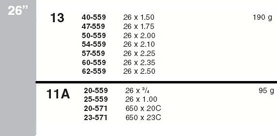 Rozpiska opon na które pasuje odpowiedni numer/typ dętki.