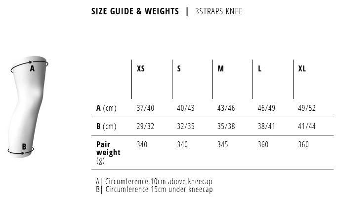 Rozmiary: XS–XL, dopasowanie według obwodu nad i pod kolanem.