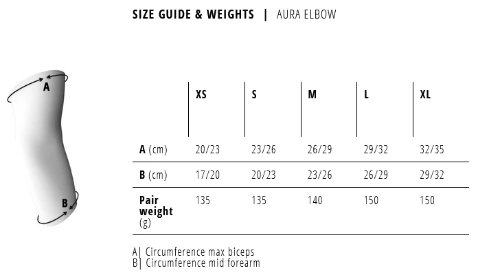 - Rozmiary: XS–XL, dopasowanie według obwodu bicepsa i przedramienia.