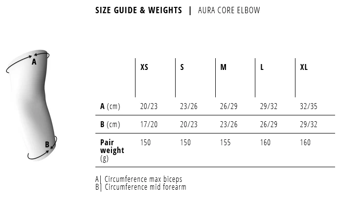 - Rozmiary: XS–XL, dopasowanie według obwodu bicepsa i przedramienia.